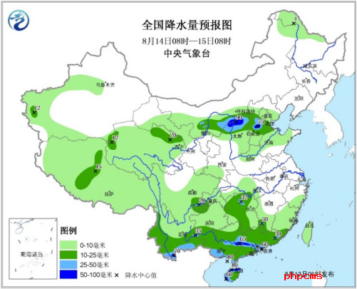 圖2 全國降水量預(yù)報圖(8月13日08時—14日08時)