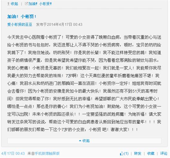 “愛(ài)小彬賢的豆豆”是女孩的微博名稱(chēng),她寫(xiě)了一段話私信了邯鄲之窗微博,她記錄了看望小彬嫻的整個(gè)心理動(dòng)態(tài),她希望用自己的方式給予小妹妹精神上的支持與幫助,她愛(ài)小彬嫻,所以她會(huì)一直在小彬嫻身邊。